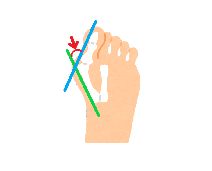 足の親指の長軸線(水色の線)とその親指の骨と関節している