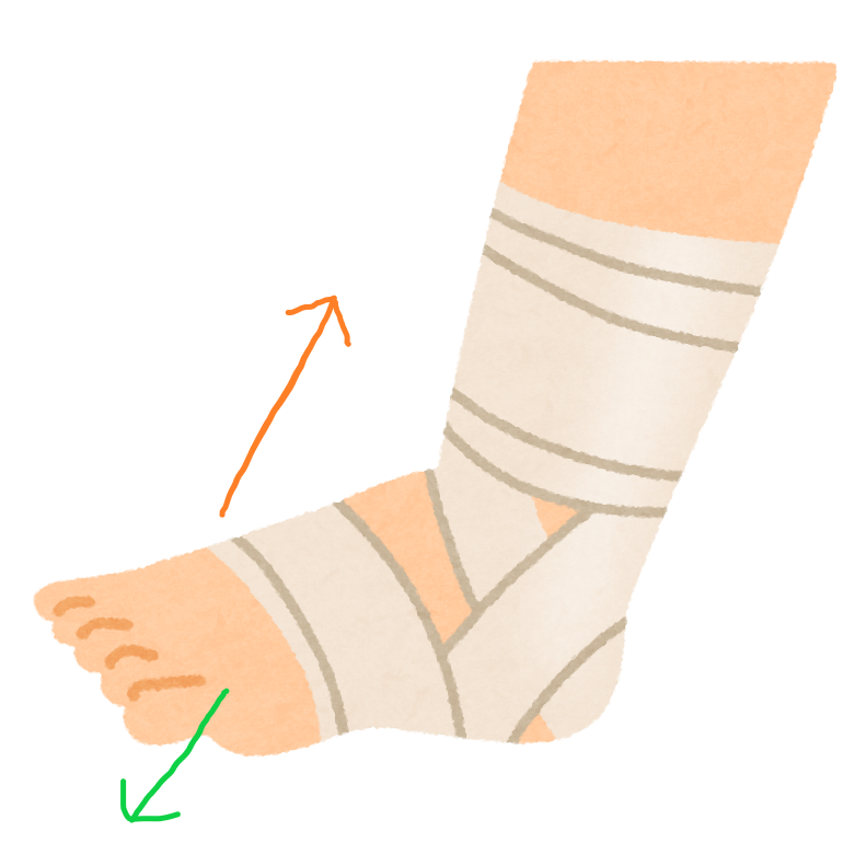 捻挫をしてしまう時は、足首が底屈(つま先を寝かす方向)の肢位で起こります。